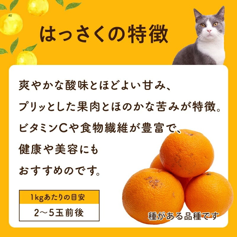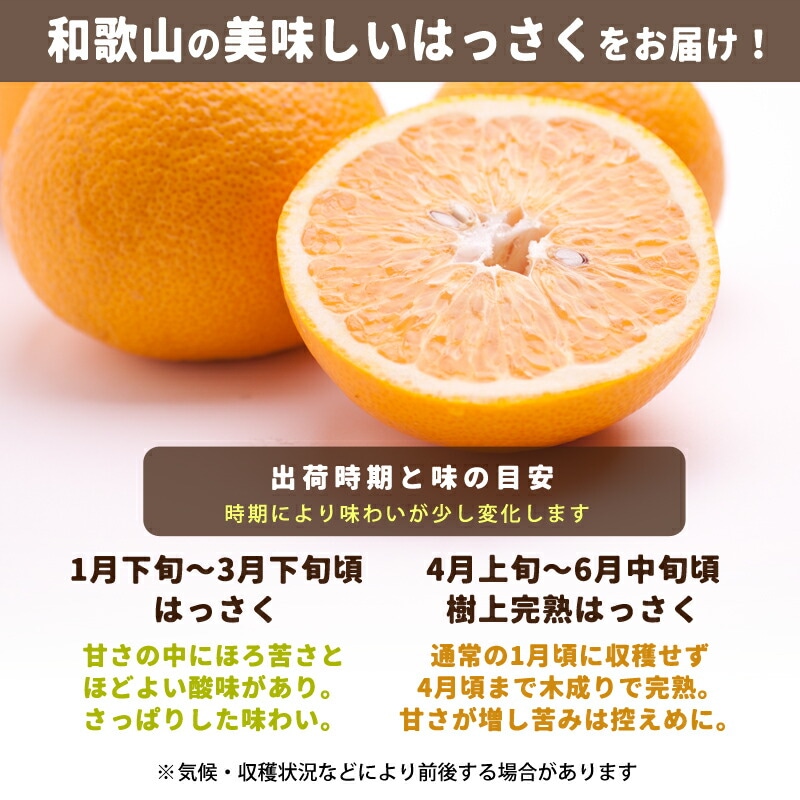 | はっさく生産量日本一の和歌山県。その恵まれた自然で育った味わいを、農家直送でお届けいたします。 はっさく:1月下旬~3月下旬頃/江戸時代から作られている柑橘で、現在和歌山県で約70%が栽培されています。少し苦みと芳醇な味わいがマッチして、うまみがあるのに後味はサッパリした味わいです。 樹上完熟はっさく:4月上旬~6月上旬頃/通常のはっさくは1月頃収穫しますが、4月頃まで木成りで完熟させました。寒い冬を樹上ですごしたはっさくは、濃厚な甘みが増し、通常のはっさくより苦みが少な目です。霜などで果実が傷むリスクがあるのですが、無事に過ごしたはっさくの味は格別です。木成りはっさく、さつき八朔などとも呼ばれます。 ※種がある品種です |
