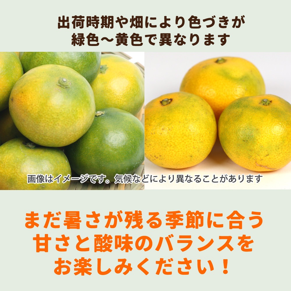 甘さと酸っぱさのバランスが、暑さの残る10月に合う爽やかな味です。昔から初みかんとして人気の極早生みかんの品種です。冬のみかんとは一味違う爽やかでさっぱりとした味をお楽しみいただけます。